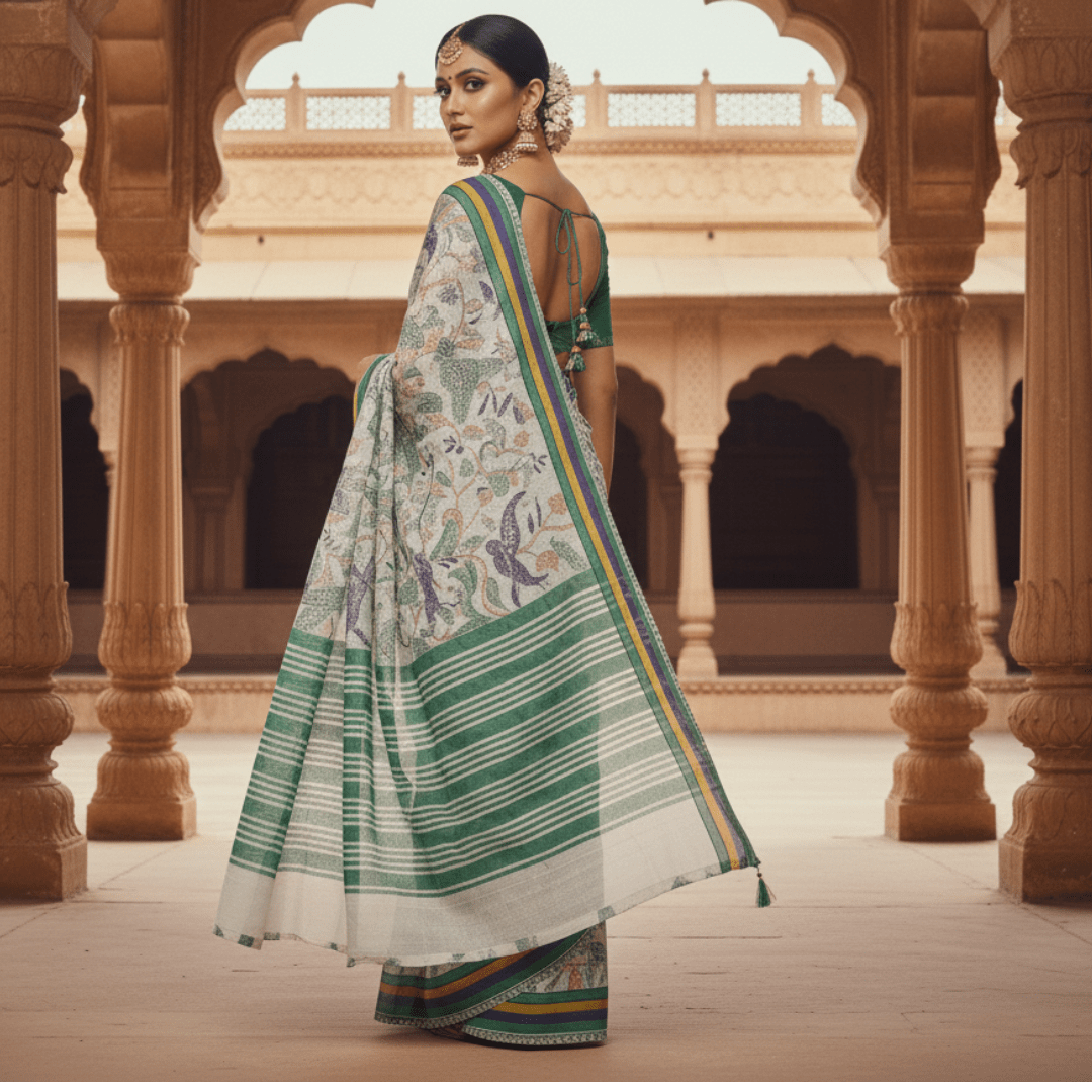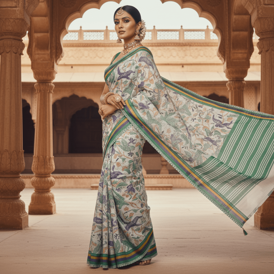The soothing white base paired with refreshing green accents creates a graceful and calming look, while the fine mol mol cotton weave ensures a smooth, airy drape. Gentle on the skin and easy to carry, this saree is ideal for daily wear, office wear, pujas, summer outings, casual gatherings, and gifting.